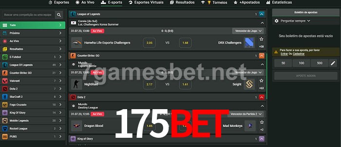 O 175Bet oferece uma grande seleção de opções de apostas em e-sports com probabilidades competitivas